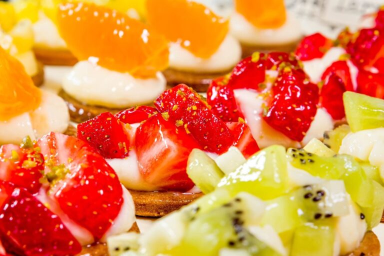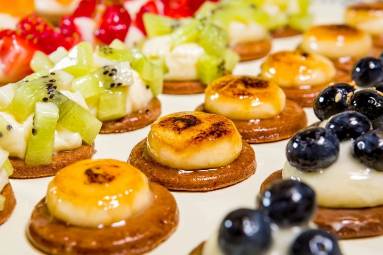Mini peces dolçes sobre discos de pasta brisa on el convidat es la crema i fruita de temporada.