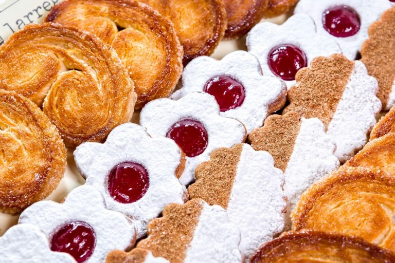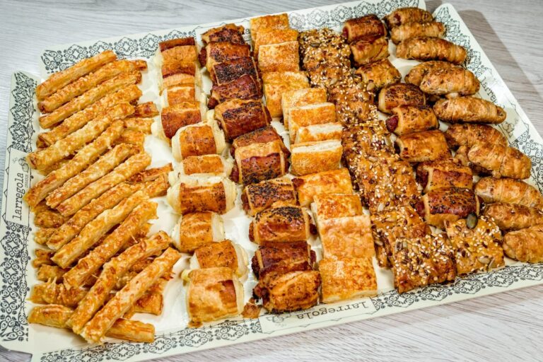 Peces de 40gr de mini xuxos, pretzels, sneckers, reixes de cabell i crema, cruasants de melmelada, trenes de full i cabell.